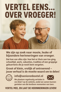 Schrijf je herinnering op (een paar regels of een heel verhaal, alles is goed) en stuur het naar ons via info@seniorenboxtel.nl